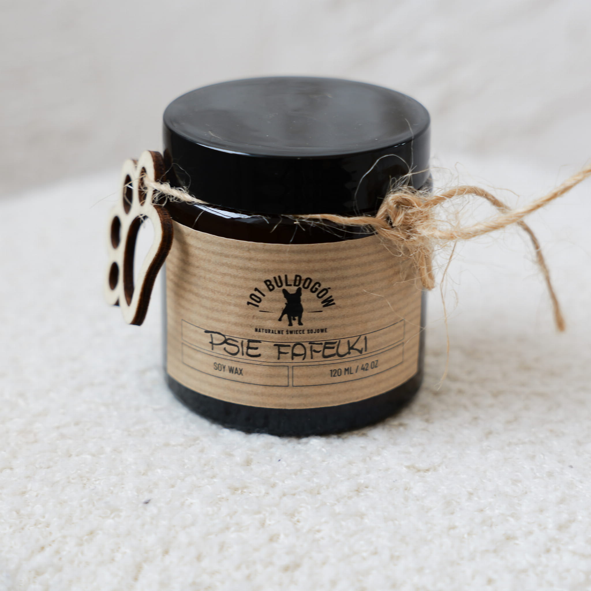 Każda świeca zamknięta jest w szklanym, brązowym słoiczku z nakrętką, z elegancką, naturalną etykietą oraz drewnianą psią łapką przewieszoną za pomocą jutowego sznureczka. Nasze produkty pakujemy w ekologiczne pudełka kraftowe.
